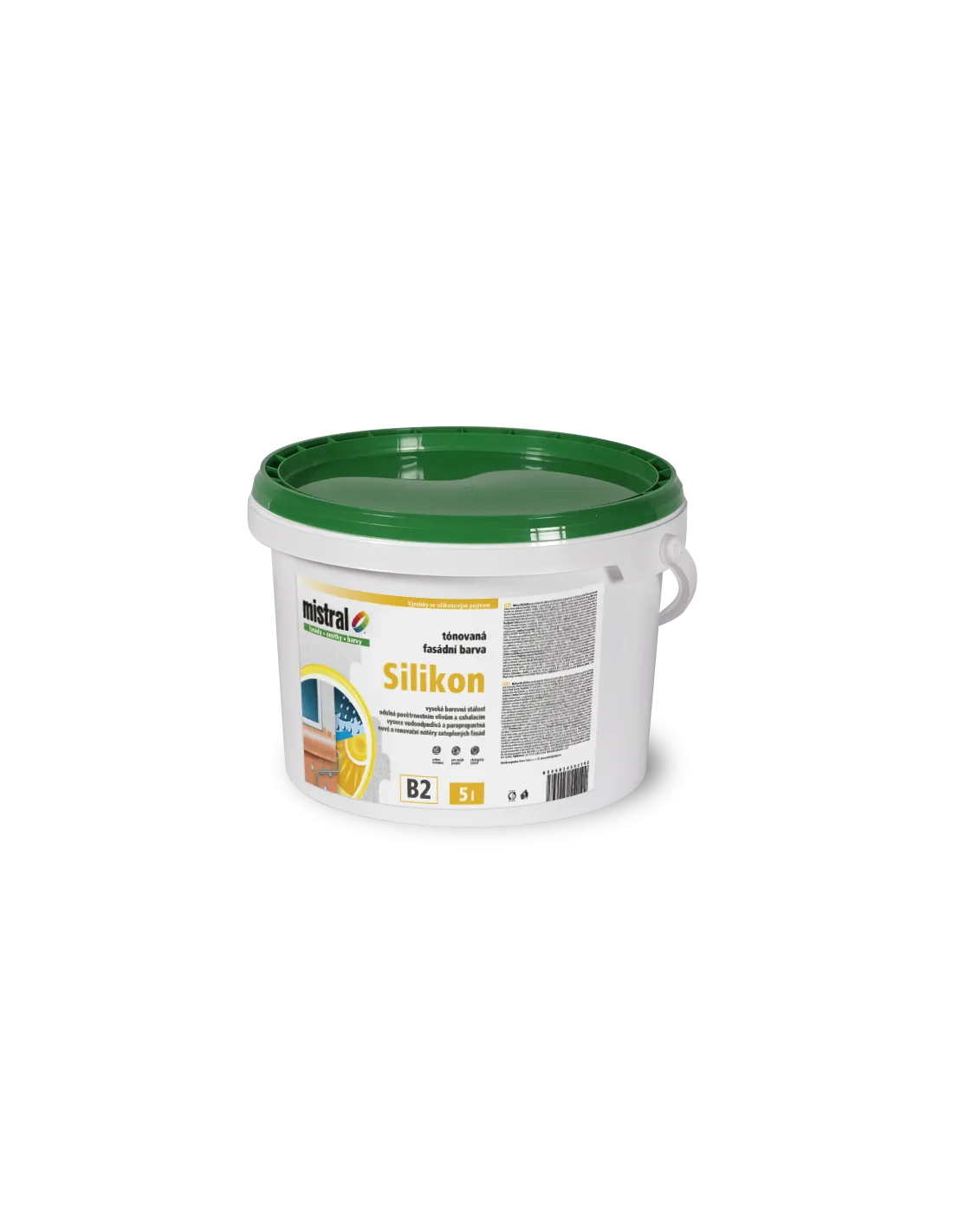 Silikonová fasádní barva, propustná pro vodní páry, odolná vůči prachu a povětrnostním vlivům.