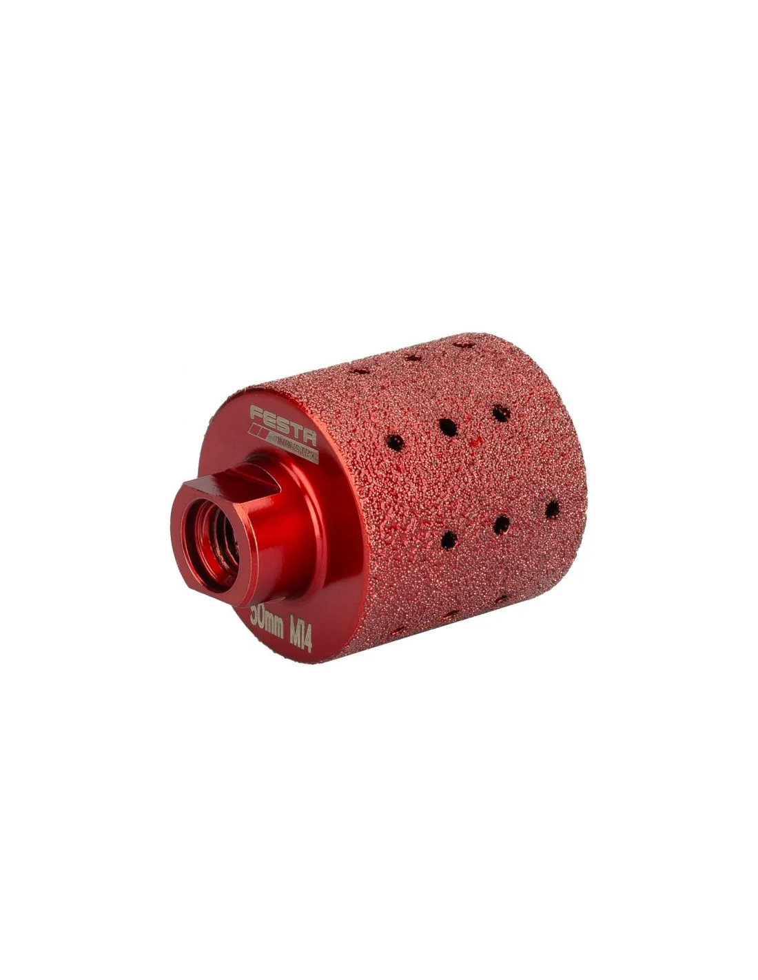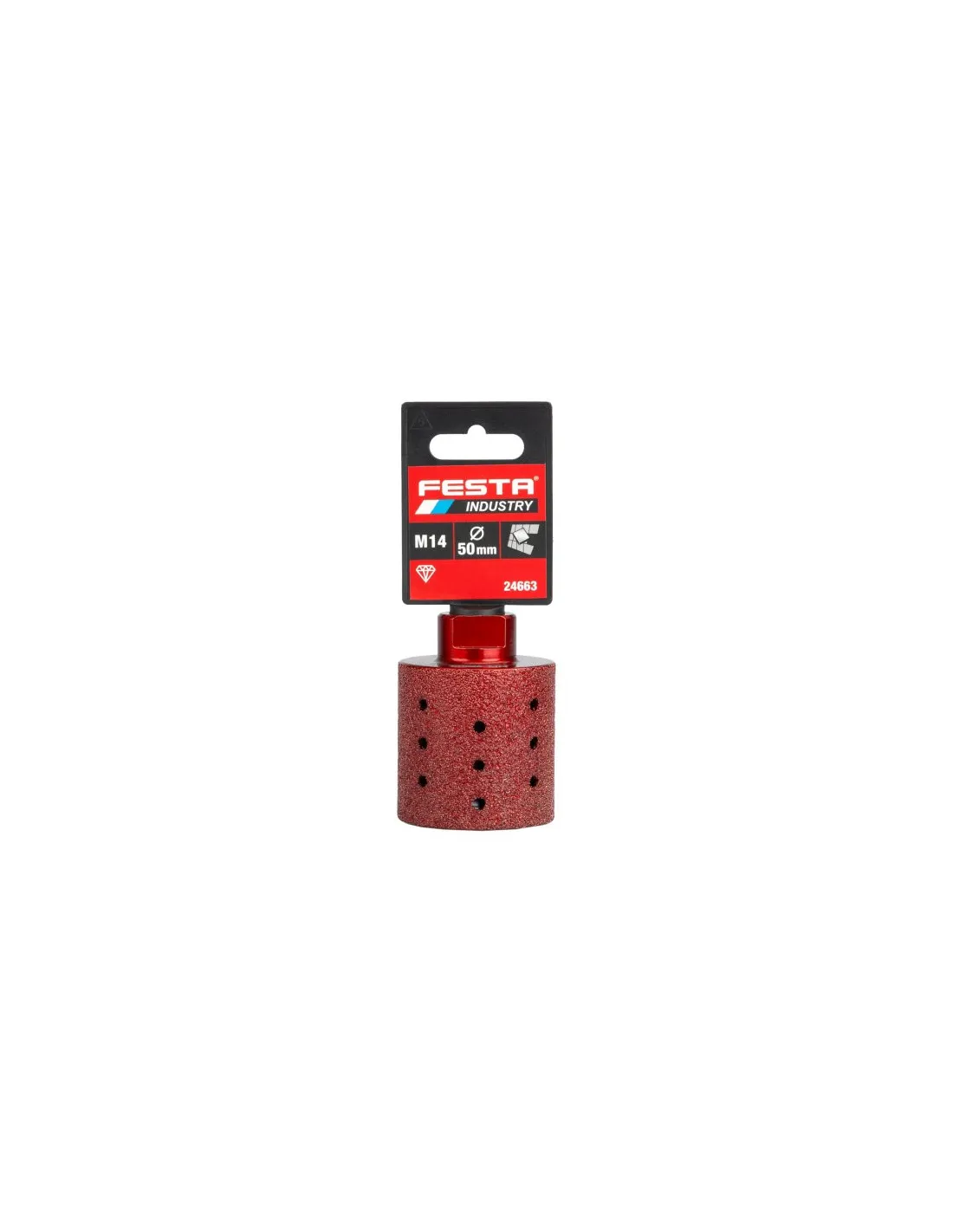 Diamantové korunky pod značkou FESTA INDUSTRY rozšiřují řadu produktů určených zejména pro profesionální použití.Válcový tvar s průměrem jen 50 mm pro rychlé zabroušení - začištění vykroužených otvorů nebo zvětšení vykroužených otvorů na potřebný průměr nebo tvar.Pro "suché" i "mokré" broušení kamene, dlažby, tvrdých obkladů, slinutých dlažeb, žuly, mramoru a jiných extrémně tvrdých materiálů nejen ve stavebnictví.Doporučený pracovní postup - našroubujte korunku přímo na závit M14 hlavy úhlové brusky, pevně dotáhněte nebo přes adaptér 22087 na vrtačku/akuvrtačku.Korunka není určena k vrtání!