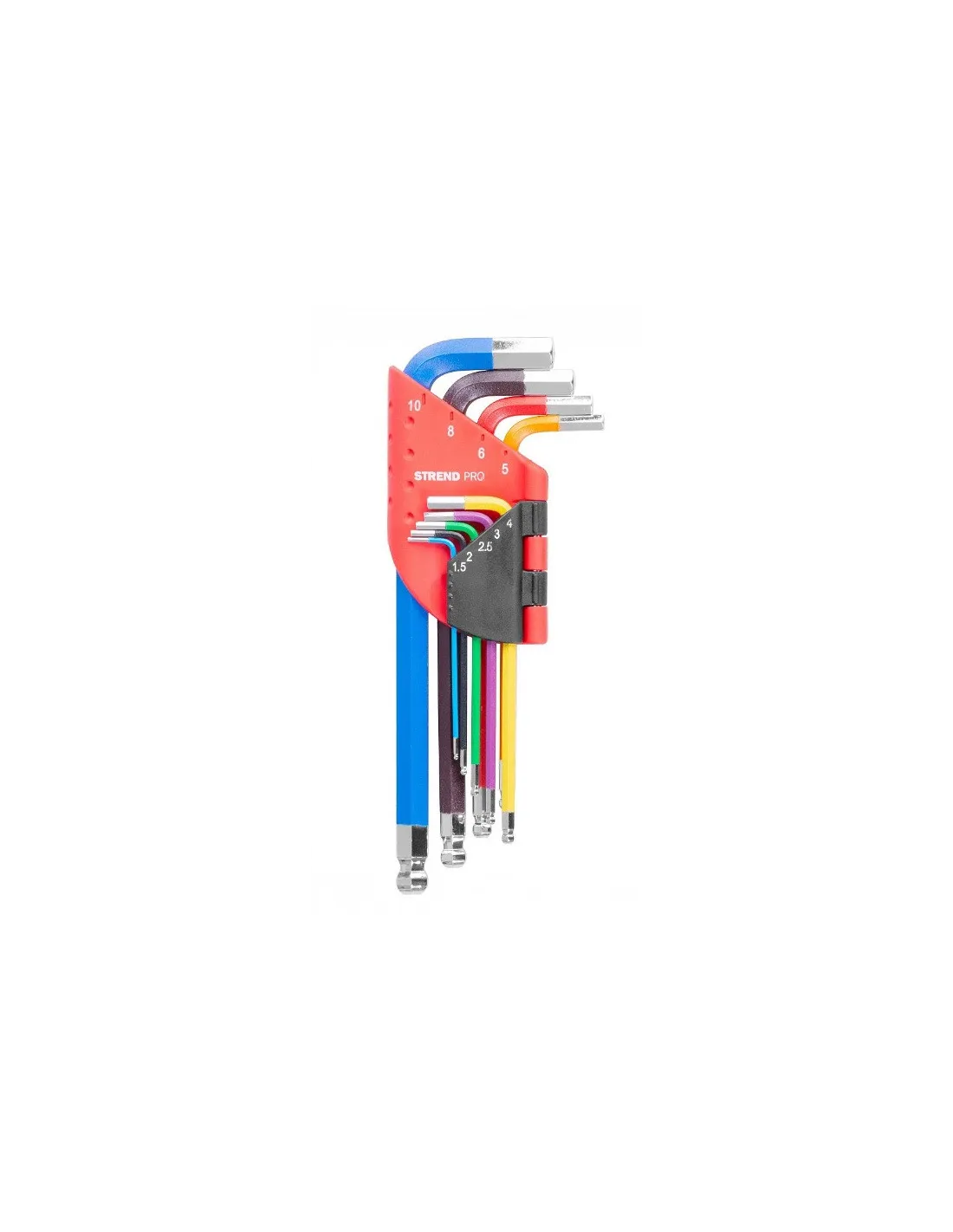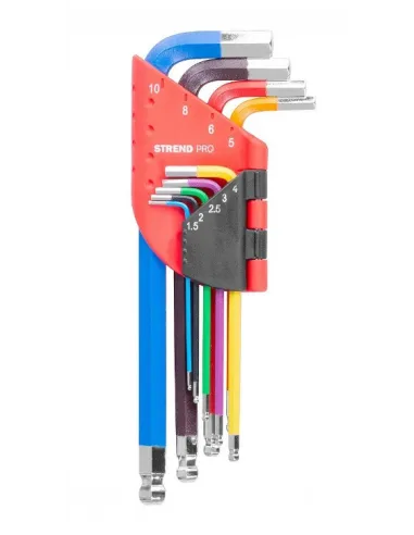 Sada imbusových klíčů obsahuje 9 kusů klíčů ve velikostech 1,5; 2; 2,5; 3; 4; 5; 6; 8; 10 mm. Jednotlivé velikosti jsou barevně rozlišeny. Jsou uloženy v praktickém pouzdře. Kuličkové zakončení umožňuje používat klíč při sklonu až 30°.