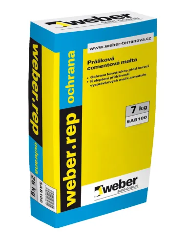 Suchá směs na na ochranu armatury v betonu před korozí a ke zvýšení přídržnosti vysprávkové malty k armatuře. Weber.rep ochrana se rozředí čistou vodou do konzistence hustého těsta, potom se pomalým přidáváním vody a za stálého míchání dosáhne konzistence vhodné na natírání. Doporučené množství vody je cca 0,25 l na 1 kg suché směsi.