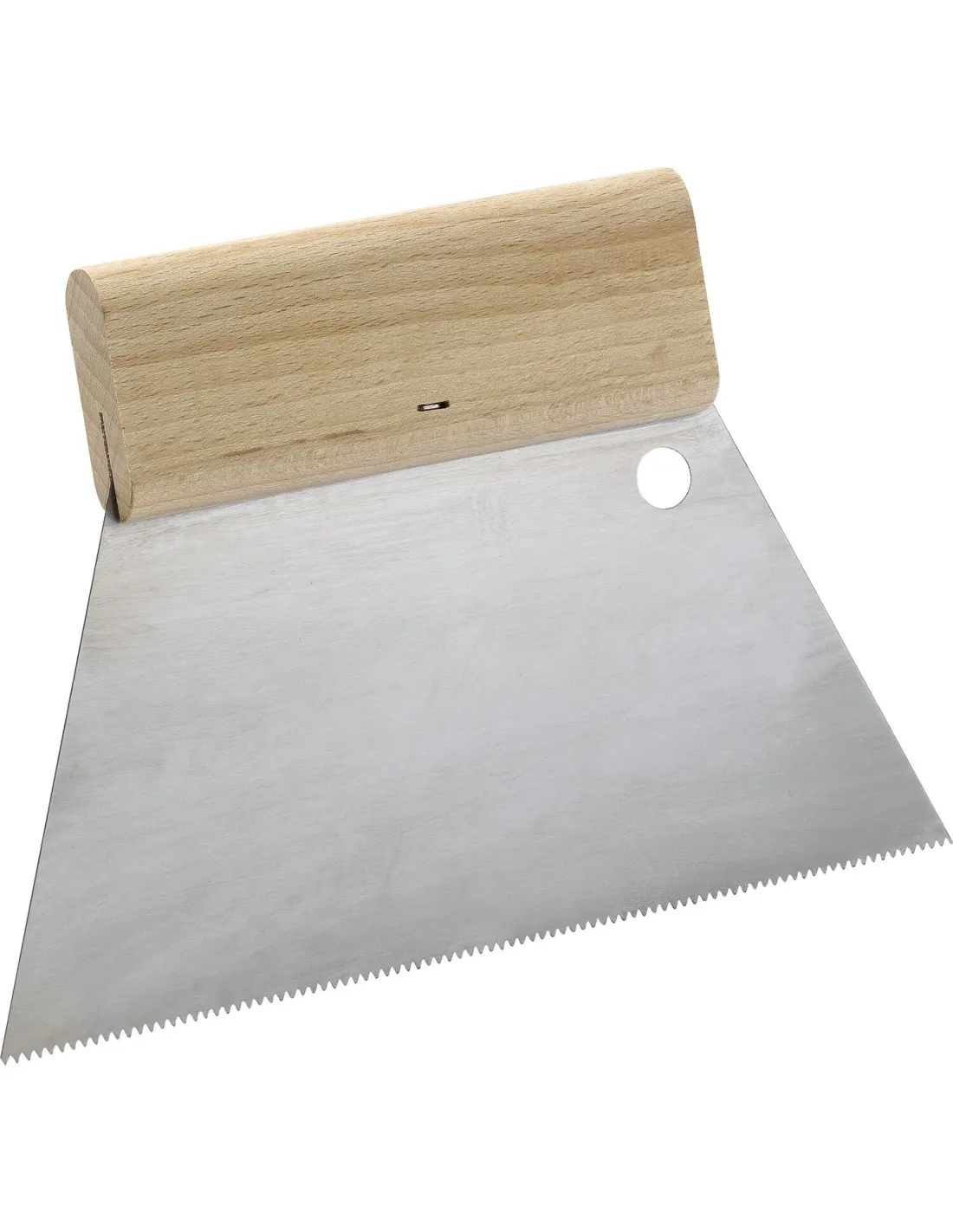 S dřevěnou rukojetí, silný ocelový list. Volitelně lze dodat ve třech ozubeních: špičaté, trapézové nebo čtvercové.