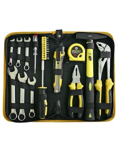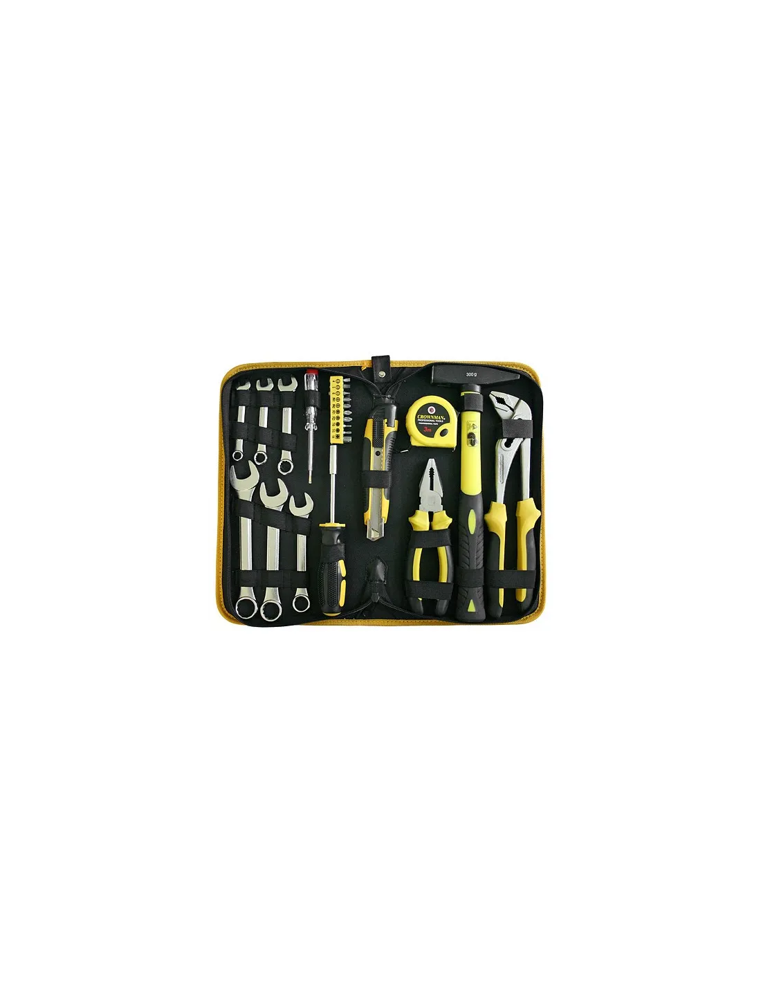 Sada nářadí dílenská 23 dílů: 6x klíč očkoplochý: 8-10-12-14-17-19mm,1x metr výsuvný 3m,1x nůž odlamovací,1x kleště kombinované 180mm,1x kleště nastavitelné 250mm, 10 sada bitů,1x zkoušečka “pero“,1x kladivo sklolaminát 300g,1x šroubovák, nástavec na bity.