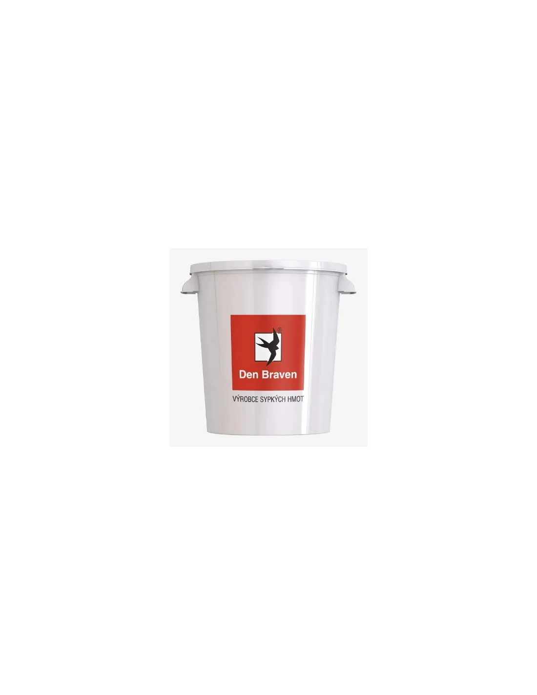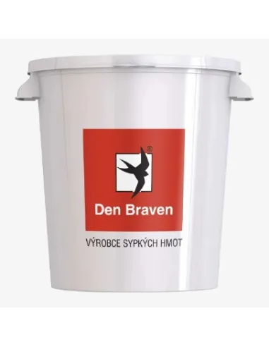Pro míchání sypkých pytlovaných hmot značky Den Braven s vodou. Na kbelíku je potisk s různými pytlovanými hmotami Den Braven a s vyznačenou spotřebou vody pro míchání materiálů.