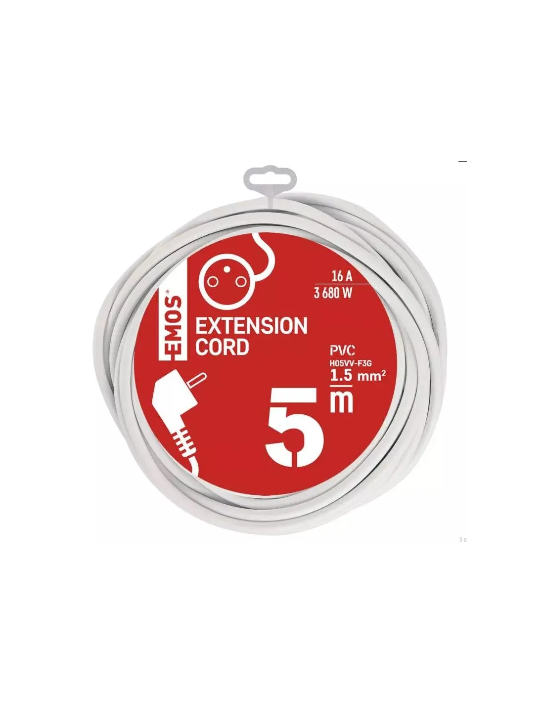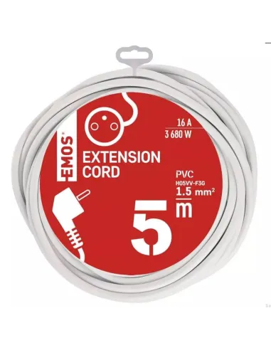 Bílý prodlužovací přívod s jednou zásuvkou - spojka, délkou 5 m a průřezem vodiče 1,5 mm2. Vhodný pro maximální zátěž 16 A max.