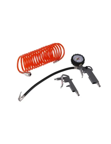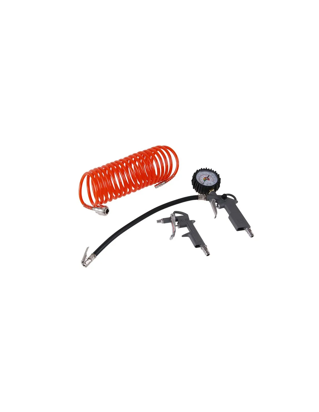 Kompresorová sada se skládá z pistole nafukovací s manometrem - pro snadné plnění stlačeným vzduchem (např.pneumatik automobilů, kol apod.), pistole ofukovací - pro vyfukování např. kovového prachu ze špatně přístupných míst, spirálová hadice 5m - pro připojení pneumatického nářadí ke kompresoru. Pracovní tlak 5barů - max. 8barů.