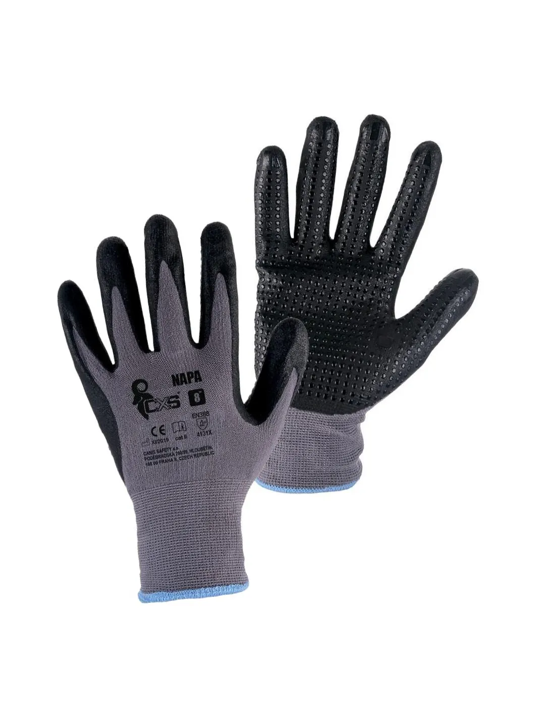 - 97% nylon, 3% elastan - spandex, máčené v nitrilu, šedý bezešvý úplet, protiskluzové terčíky
