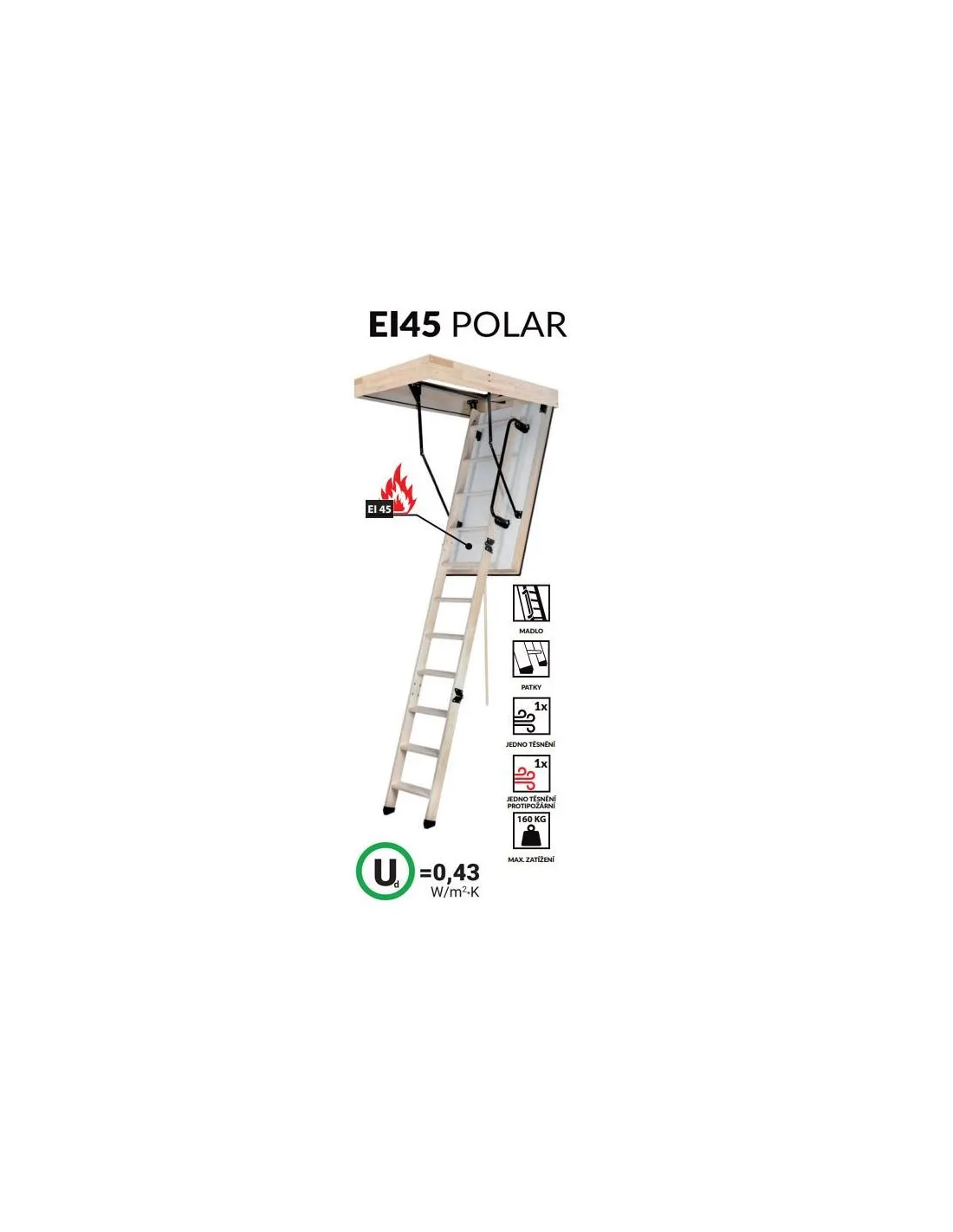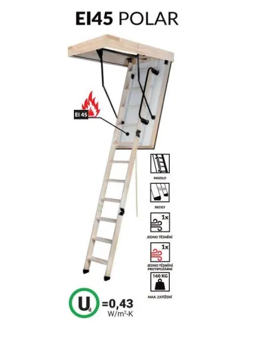 Půdní schody EI45 POLAR jsou energeticky úsporné ohnivzdorný podkrovní schody. Jsou vybaveny dvojitou utěsněnou klapkou o tloušťce 86 mm, díky níž je koeficient přenosu tepla klapky 0,43 W / m2 * K, což zaručuje nízké tepelné ztráty a šetří náklady na energii. Použitá protipožární ochrana zaručuje požární odolnost na úrovni EI45. Pro zvýšení bezpečnosti jsou schody EI45 POLAR vybaveny madlem, které usnadňuje vstup a mají protiskluzové nohy.