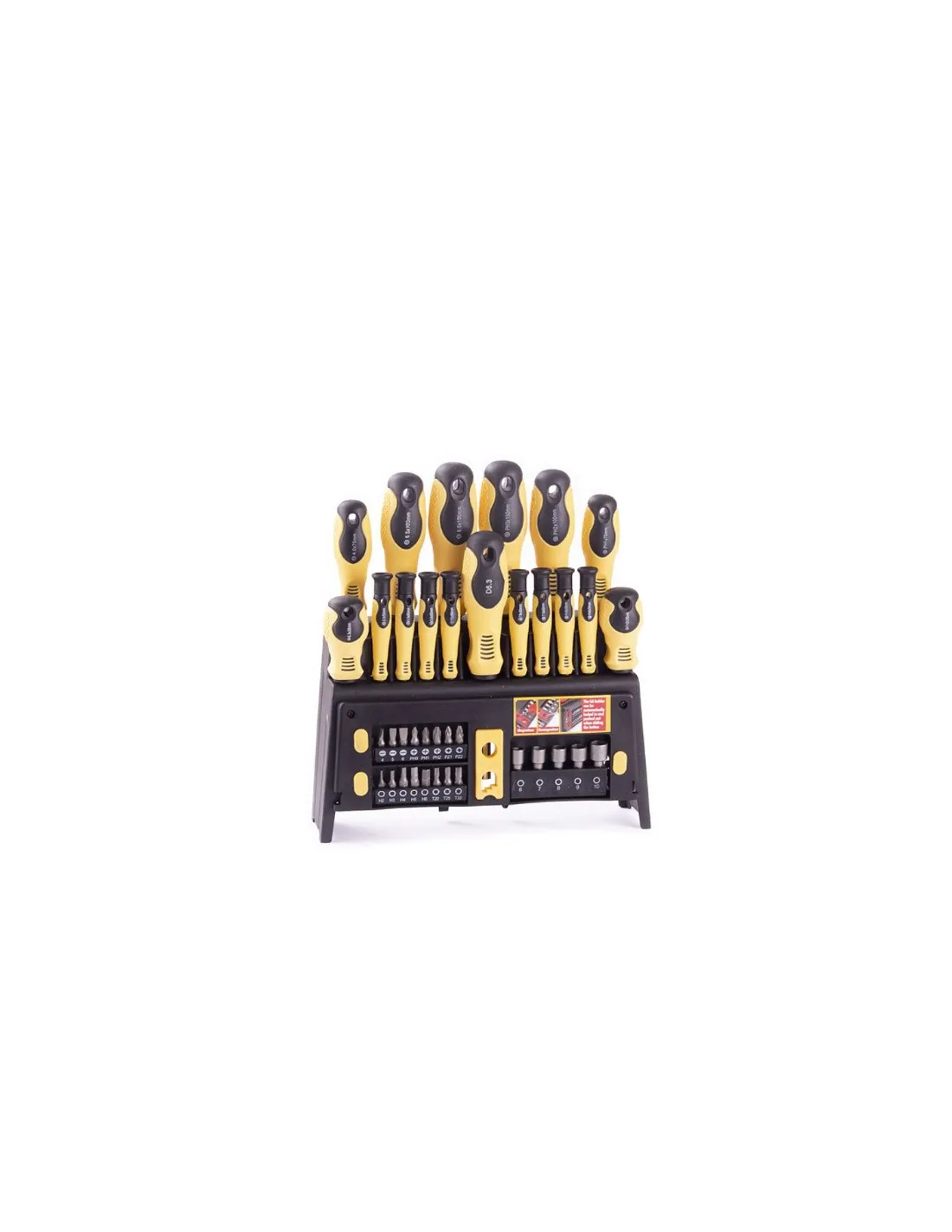 Stojan (možnost zavěšení na stěnu) . Magentizovač / odmagnetizovač. Adaptér pro bity 1/4" šestihran. Nástrčné klíče 5ks: 6, 7, 8, 9, 10 mm. Šroubováky ploché 4ks: 6.5x38, 5.5x75, 6.5x100, 8x150. Šroubováky PH 4ks: PH2x38, PH1x75, PH2x100, PH2x150. Mikrošroubováky 8ks: 2.0, 2.5, 3.0, PH00, PH0, T6, T8, T10. Bity 16ks 1/4: ploché 4, 5, 6, PH0, PH1, PH2, PZ1, PZ2, T20, T25, T30, H2, H3, H4, H5, H6,