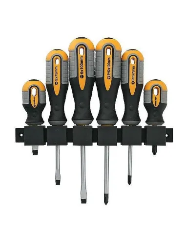Sada šroubováků s profesionální rukojetí. Šroubovák plochý: 5x75, 6x100. Šroubovák plochý Mini: 6x38. Šroubovák Phillips: PH1x75, PH2x100. Šroubovák Phillips Mini: PH2x38. Plastový držák na šroubováky.