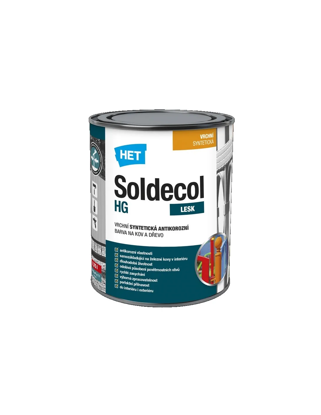 Vrchní syntetická vysoce lesklá antikorozní barva na kov a dřevo. Do interiéru i exteriéru. K nátěrům bran, plotů, sloupků. Odolná povětrnostním vlivům.