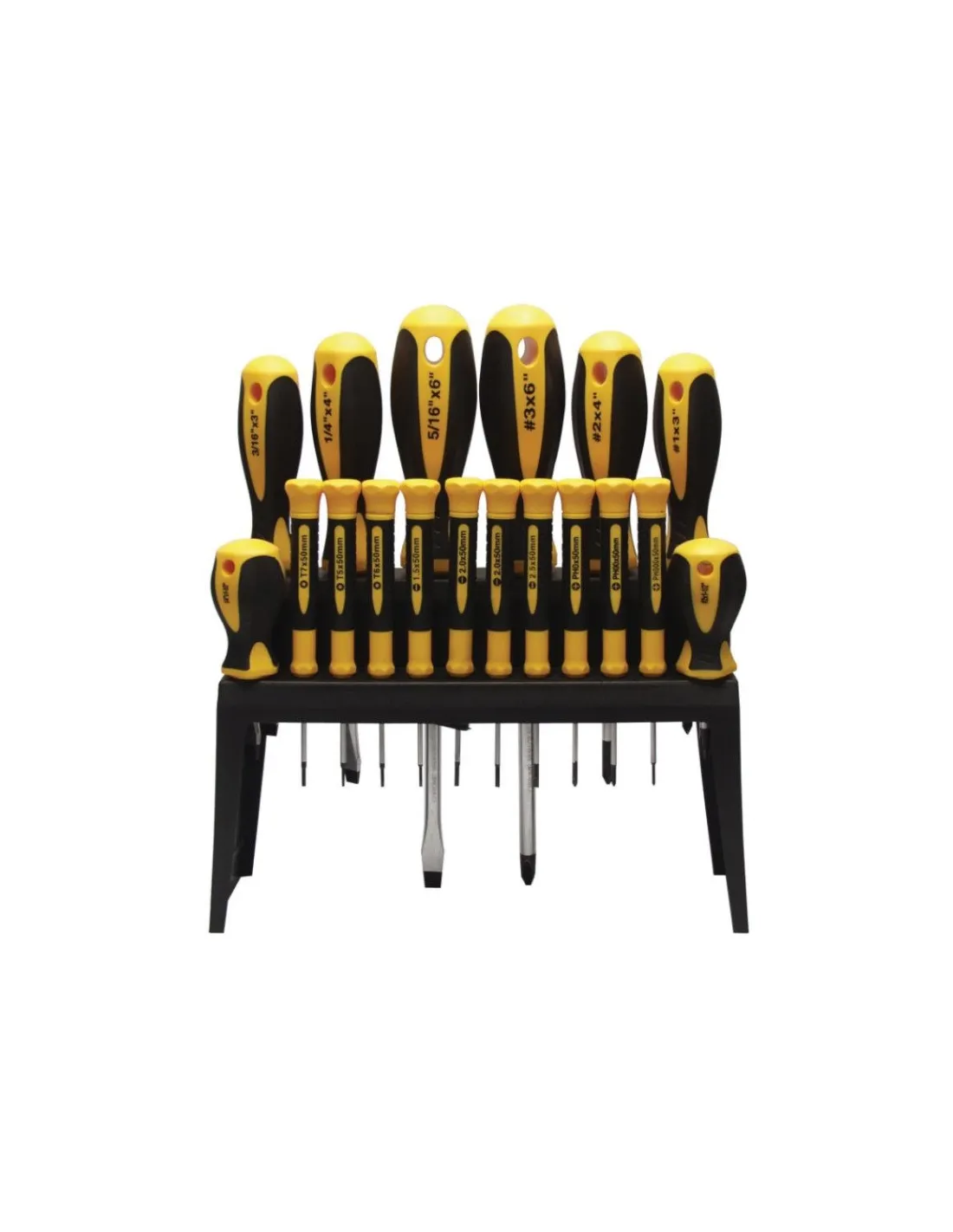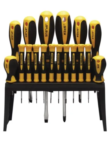Sada kvalitních šroubováků včetně plastového stojanu s plast-pryžovou rukojetí včetně antiskluzového povrchu, vyrobených z kvalitní chromvanadiové oceli, tvrzených v celé délce. Sada obsahuje: plochý (8x150, 6x100, 5x75, 6x38, 2,5x50, 3x50 mm), křížový (3x150, 2x100, 1x75, 2x38, 00x50, 0x50 mmm), TORX (5x50, 6x50, 7x50, 8x50, 9x50, 10x50 mm).