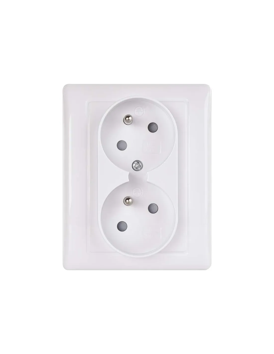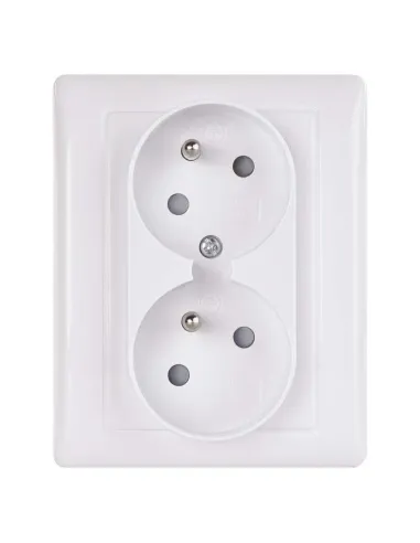 Kvalitní dvojnásobná FRENCH zásuvka s integrovanými dětskými clonkami. Montáž do krabice. IP20. Šroubové svorky. Dvě pootočené zásuvkové dutiny.