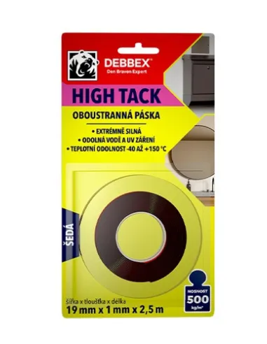 Oboustranná pěnová páska HIGH TACK s extra silnou akrylátovou lepicí vrstvou. Přilne k široké škále podkladů, a to velmi silně. Má velkou výhodu v okamžité plné přídržnosti, tím urychluje montáž a uvedení lepeného předmětu do provozu.